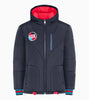 The perfect combination of style and functionality: The quilted jacket from the famous MARTINI RACING® Collection is a real eye-catcher with practical features that hit the mark. A zip makes it possible to widen it by several centimeters – only then does the striped MARTINI RACING® tape become visible. Zippered pockets on the left chest and on the inside offer enough storage space to protect valuables from wind and rain. The hem and hood can be easily adjusted with a drawstring. On colder days, the jacket comes to the rescue with elaborate lining finishing including MARTINI RACING® print and story label. Visual highlights include the iconic striped design on the chest pocket and the knitted sleeve cuffs, the Porsche logo on the left sleeve, the striped tape with the MARTINI RACING® PORSCHE logo on the hood, and the high-quality badge on the chest.